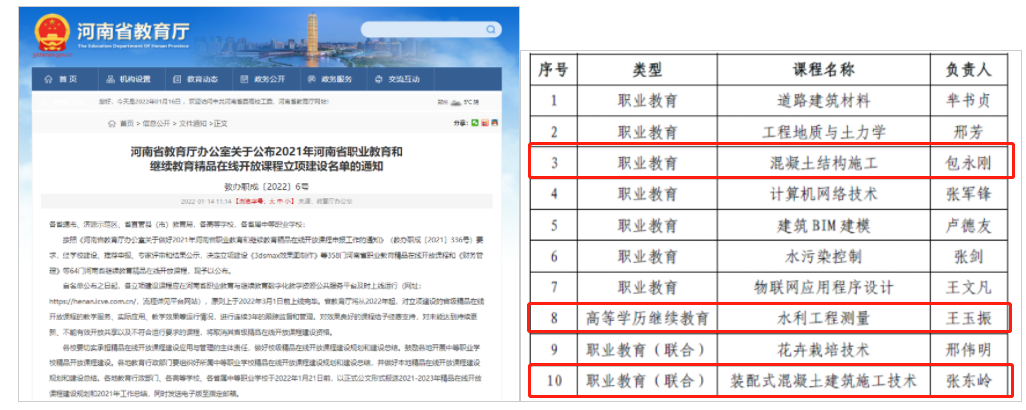 近日,河南省教育厅发布了《河南省教育厅办公室关于公布2021年河南省职业教育和继续教育精品在线开放课程立项建设名单的通知》(教办职成〔2022〕6号),我校10门课程入选职业教育和继续教育精品在线开放课程立项建设,我系3门课程入选立项。