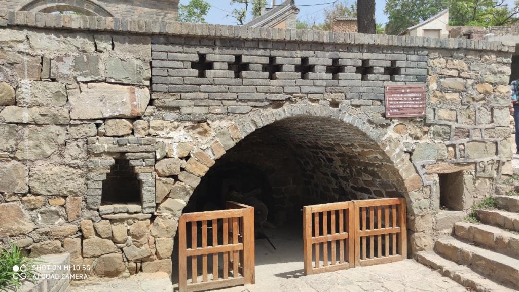 海上桥传统村落寨墙修筑于清乾隆、嘉庆(1736—1821年)年间,沿村边而建。寨墙基础厚5米,到顶宽3米,高平均10米,套板夯实,以夯土堆成。寨门用大青砖砌筑,两边衬包石块和夯土连为一体。门内设更房,派专人值守。