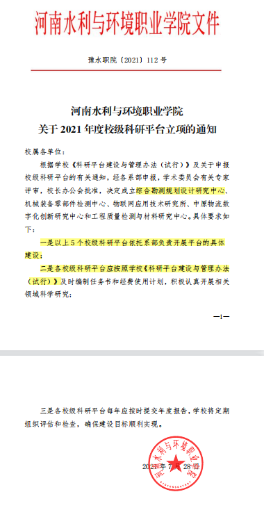 根据学校《科研平台建设与管理办法(试行)》及关于申报校级科研平台的有关通知,经各系部申报,学术委员会有关专家评审,校长办公会批准,决定成立综合勘测规划设计研究中心、机械装备零部件检测中心、物联网应用技术研究所、中原物流数字化创新研究中心和工程质量检测与材料研究中心。具体要求如下: